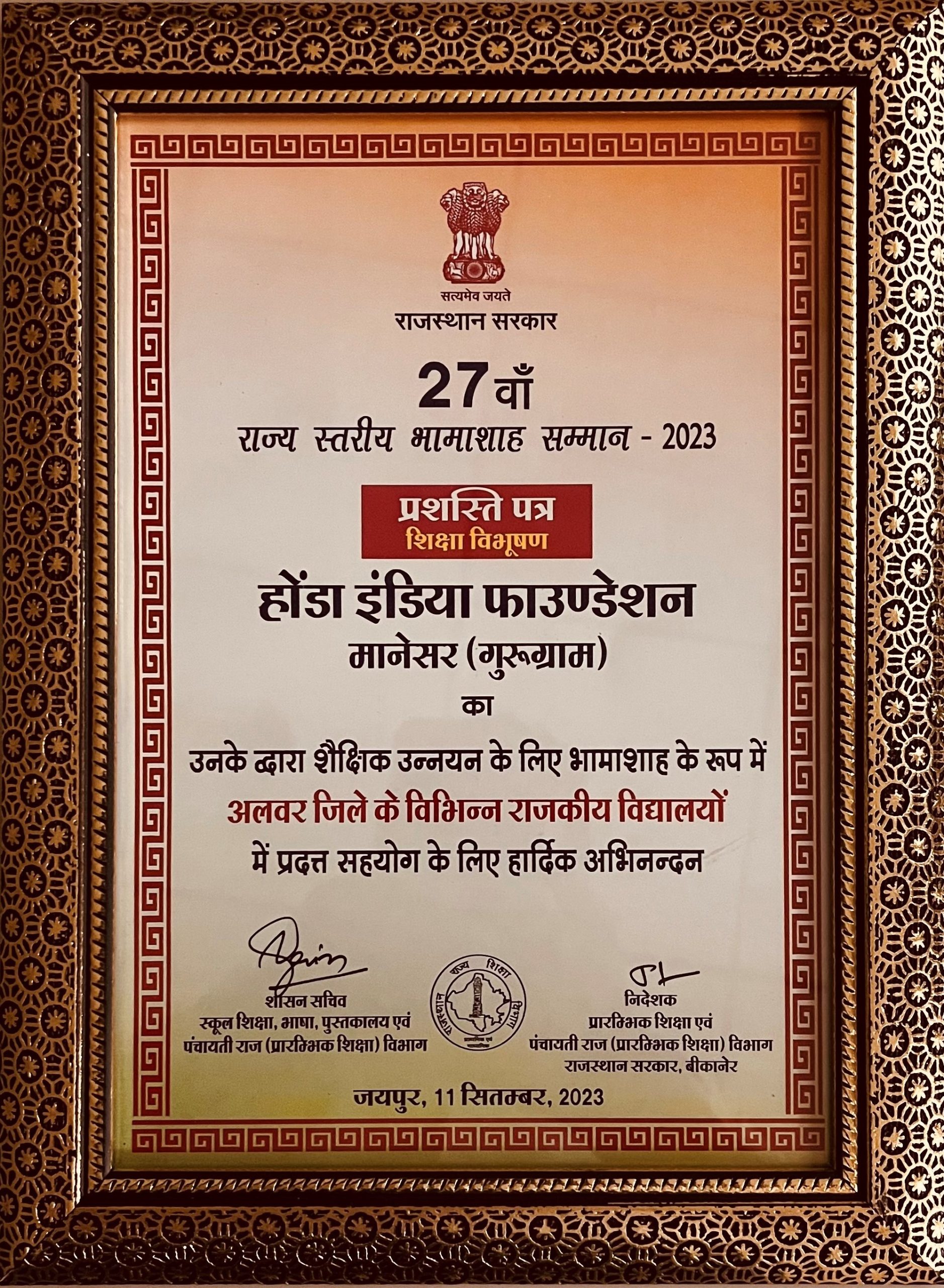 Honda India Foundation honoured with ‘BHAMASHAH AWARD’ for remarkable contribution in education sector in Rajasthan