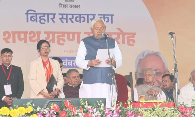 Patna : Bihar marked a historic political milestone on Thursday as Janata Dal (United) leader Nitish Kumar was sworn in as Chief Minister for a record tenth term. The grand ceremony, held at Patna’s iconic Gandhi Maidan, reaffirmed his enduring influence over state politics and strengthened the National Democratic Alliance’s mandate following its decisive electoral victory.